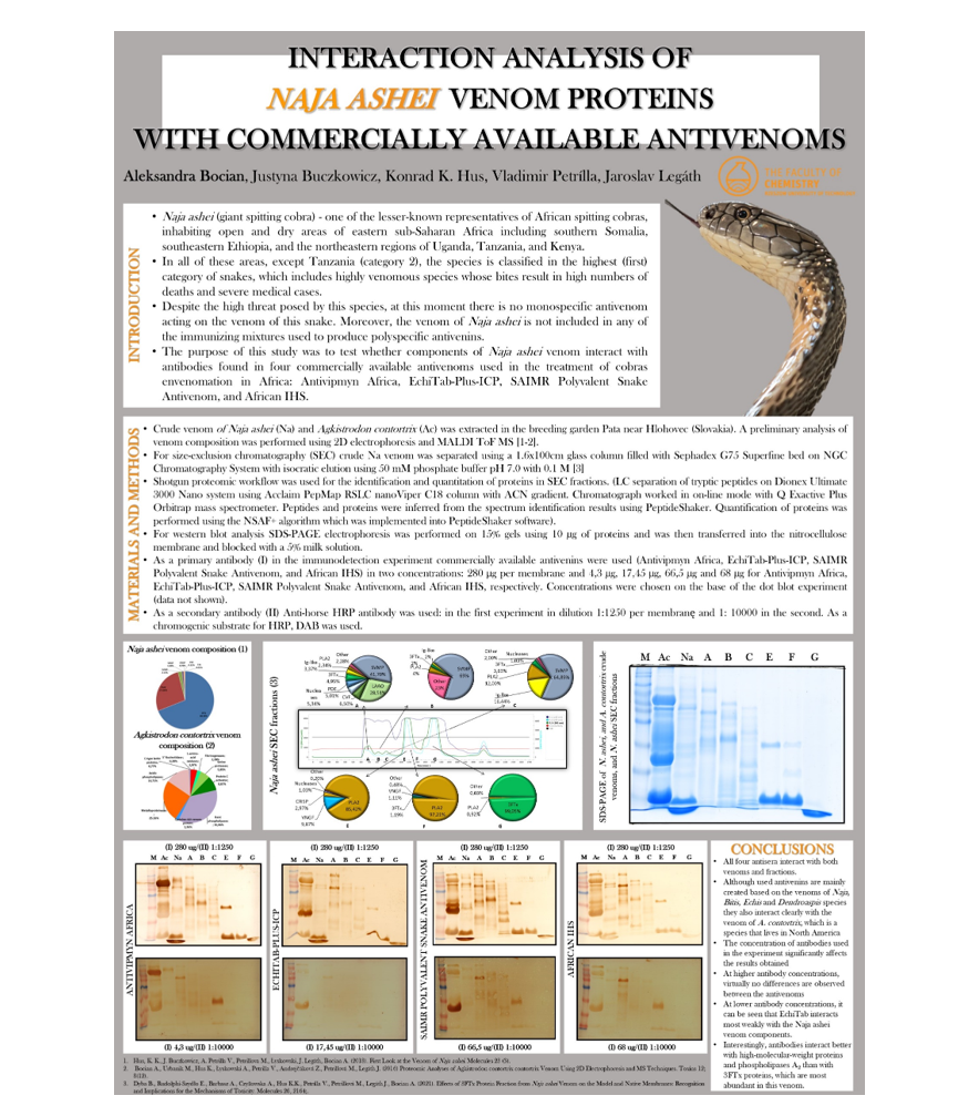 Bocian A., Buczkowicz J., Hus K.K., Petrílla V., Legáth J. (2022) Interaction studies of Naja ashei venom proteins with commercially available antivenom. 9th International Toxicology Meeting Venoms and Toxins 2022, Oxford, 23rd – 25th August 2022